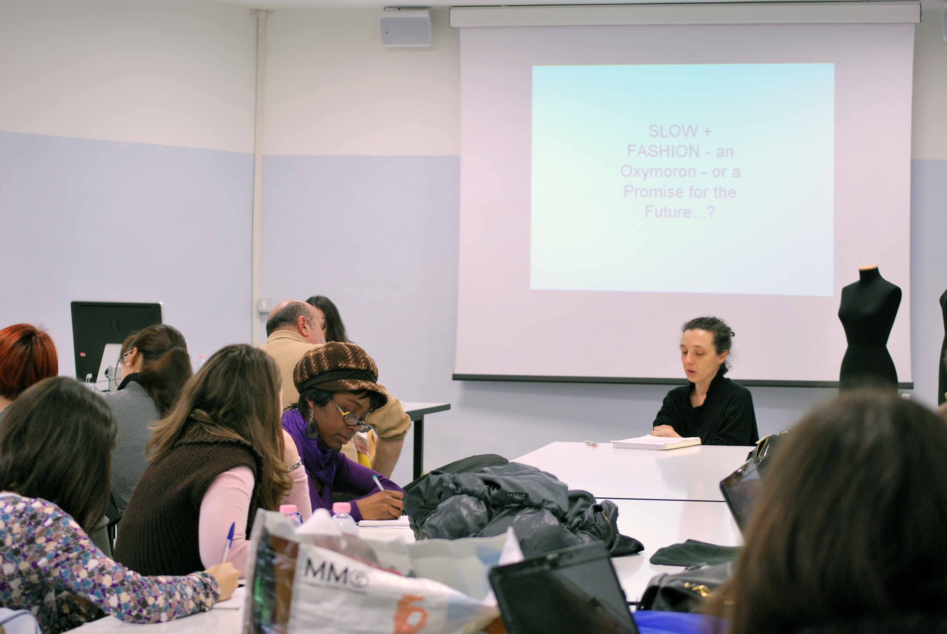 abbiamo parlato del concetto di “lentezza” : il libro di Matthew Crawford “Shop Class as Soulcraft. An inquiry into the value of work” USA, Penguin Press HC, 2009 – pubblicato in Italia dal Gruppo Mondadori “Il lavoro manuale come medicina dell’anima” 2010 / il saggio di Hazel Clark “SLOW + FASHION – an Oxymoron – or a Promise for the Future…?” in “Fashion Theory. The Journal of Dress, Body & Culture”, Volume 12, Numero 4, Decembre 2008, pp. 427-446, Berg Publishers / la teoria “think globally and act locally” nella moda / l’etichetta brasiliana Coopa Roca e le sue collaborazioni con Carlos Miele e Tord Boontje / la mostra “Naturale, rigenerato, fatto a mano. La moda etica di Christina Kim”, Bologna, Museo Internazionale e Biblioteca della Musica, dal 10.05.2008 al 08.06.2008) / la conferenza “Riciclato, fatto a mano, eco-sostenibile”, Corso di Laurea in Culture e tecniche del costume e della moda, Rimini, 14.05.2008, “I like to touch every piece because every piece have a story, is precious” / l’ “Hacking Couture” di Giana Gonzalez